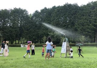 遊具では、11時と、13時と、15時に芝生でスプリンクラーが水を出して回ります。