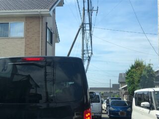 「(車が突っ込んで)電柱を道の方に倒す」という事故が起きました。 (赤丸部分)