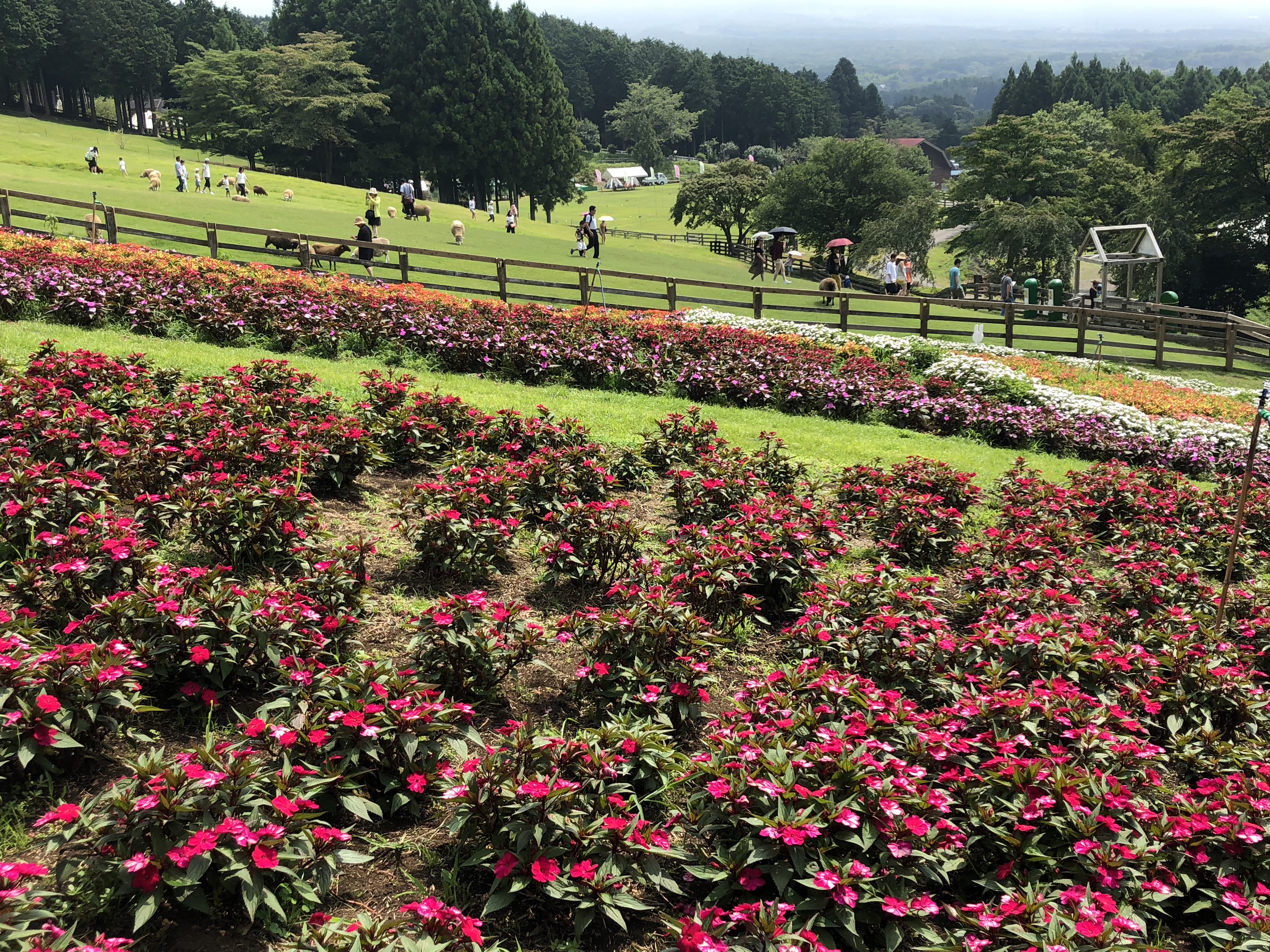 花畑の向こうに、出てきたばかりの羊と楽しむ人々。