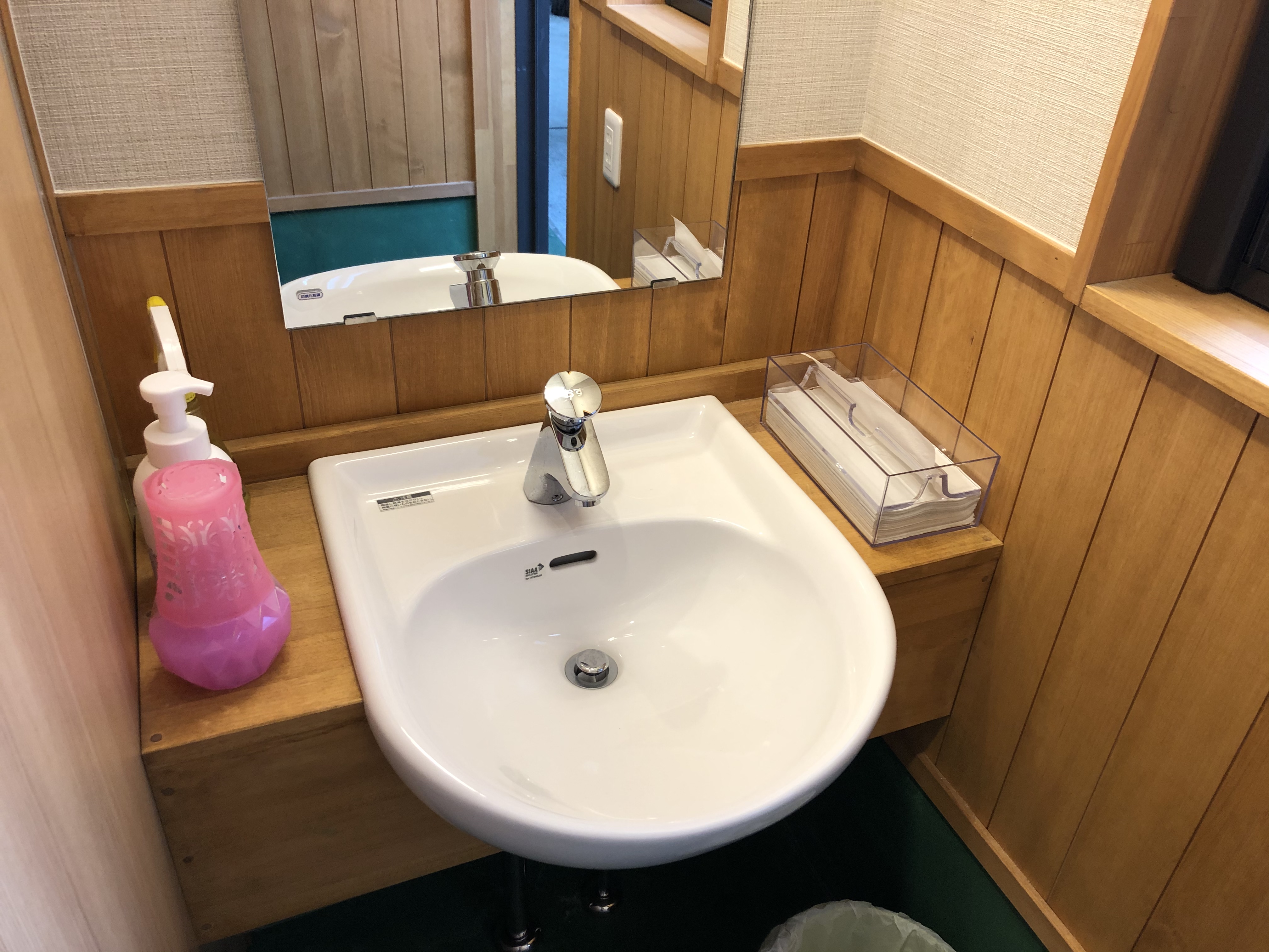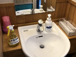 ②手洗いアワは、水道の真横がいい(使いやすい上に、手からしたたる水が洗面台からはずれた木の部分にいつもかかる状態ではカビが生えてしまう)+表示が読みやすい向きに置く