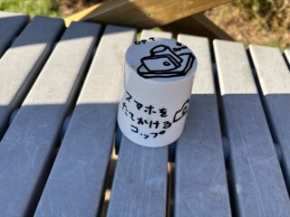 陶器のモノに「スマホたてかけコップ」と書いておいとく↓… ※+英語表記も