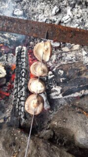 串に刺して、たき火のオキで炙る。