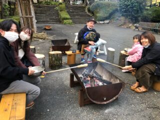 アイスクリーム作りが終わり、始まったのは「たき火でケーキの【バームクーヘン作り】」!