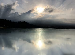 富士山から朝日が昇ってきたので、逆さ富士が取れる所へ急いで行ってみる。