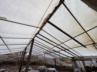 先日の大風で傷んだ青空テラスの屋根を手直しする作業、昨日やっと出来て 完了。