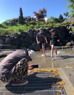 滝のある、じゃぶじゃぶ池ではこう↑構えて