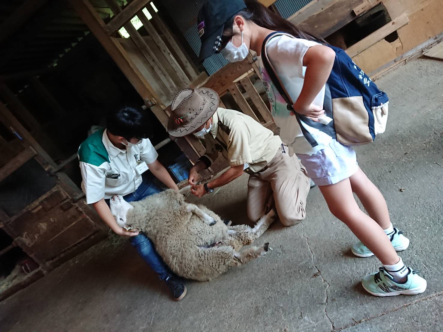 ※羊の保定や体の秘密を見せるやり方を学んでいるところ