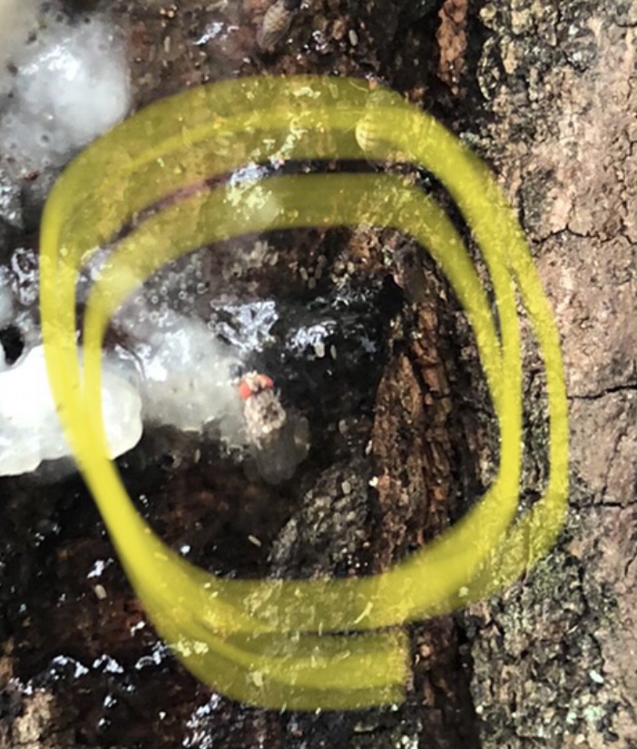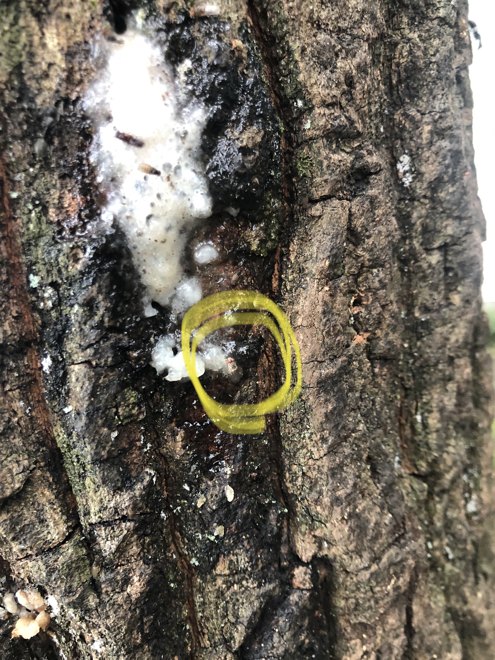 その場所は「ナラ枯れで樹液や木の粉がジュクジュクして嫌なにおいを放っている場所↑」です。