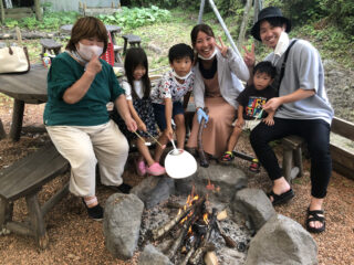 マキを組む⇒マッチで火をつける⇒うちわであおいで火を育てる⇒肉を焼いて食べる(焼きマシュマロも)