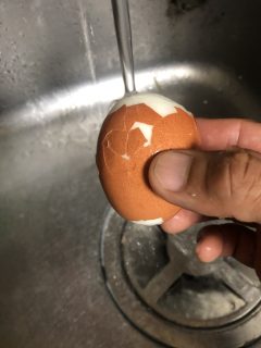 ゆで終わって、しばらく水につけて冷ましたら・・・硬い平面に卵を転がして、ヒビをビシビシにする(慣れれば2~3秒で終わる作業)。そして、卵の上と下を先にちょこっとむき(上の写真の様にむく)、水道を最大に出して「強い水流」を写真の様にドババと当てながらむくと、ツルリ!と美しく見事に手早くむくことができます。(新鮮な卵でもOK)