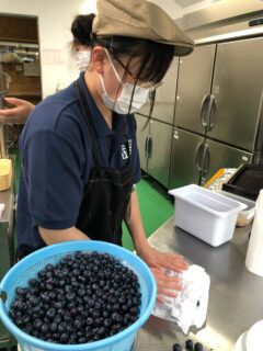 ミルクカフェで、収穫されたブルーベリーを洗って