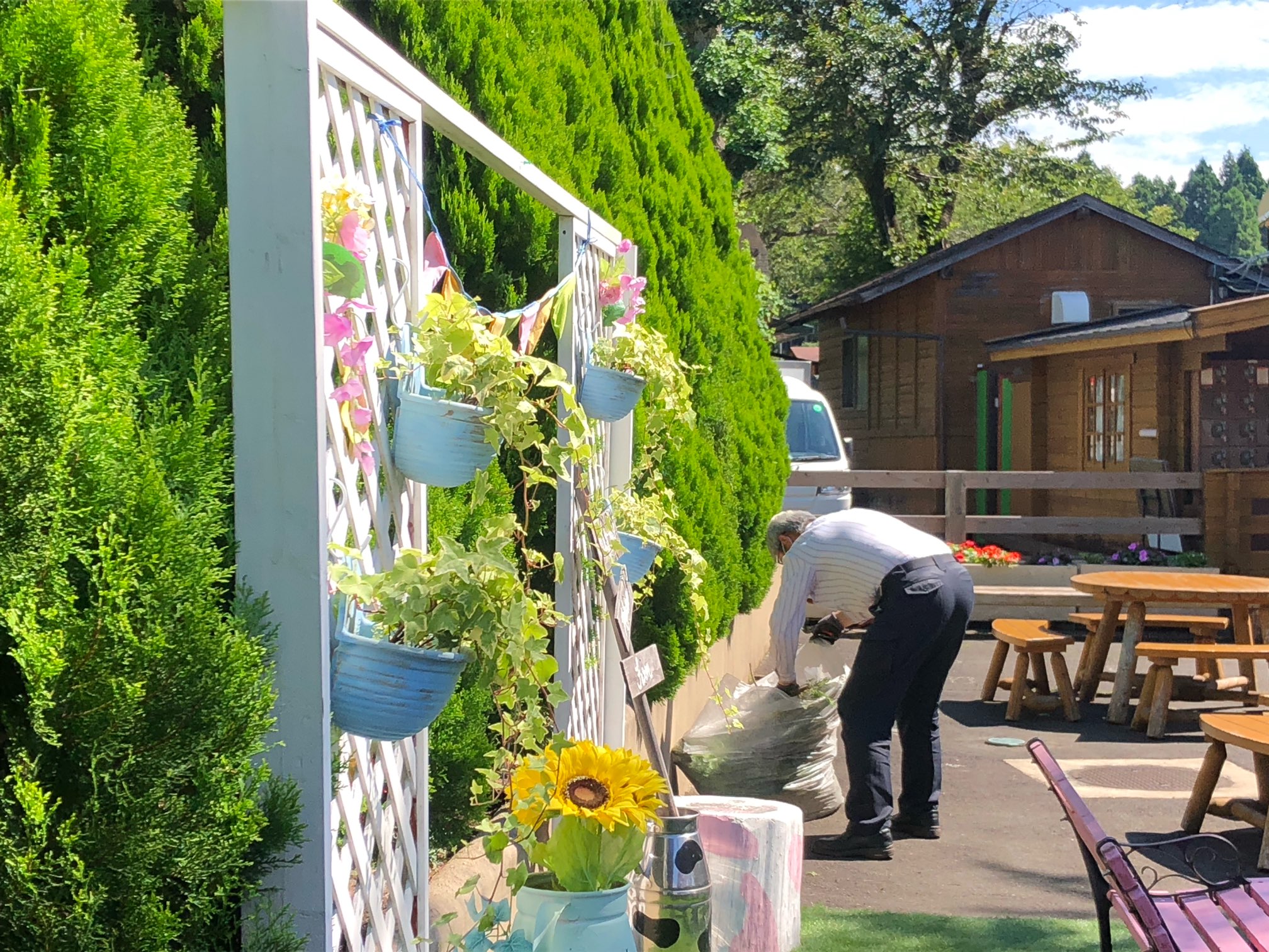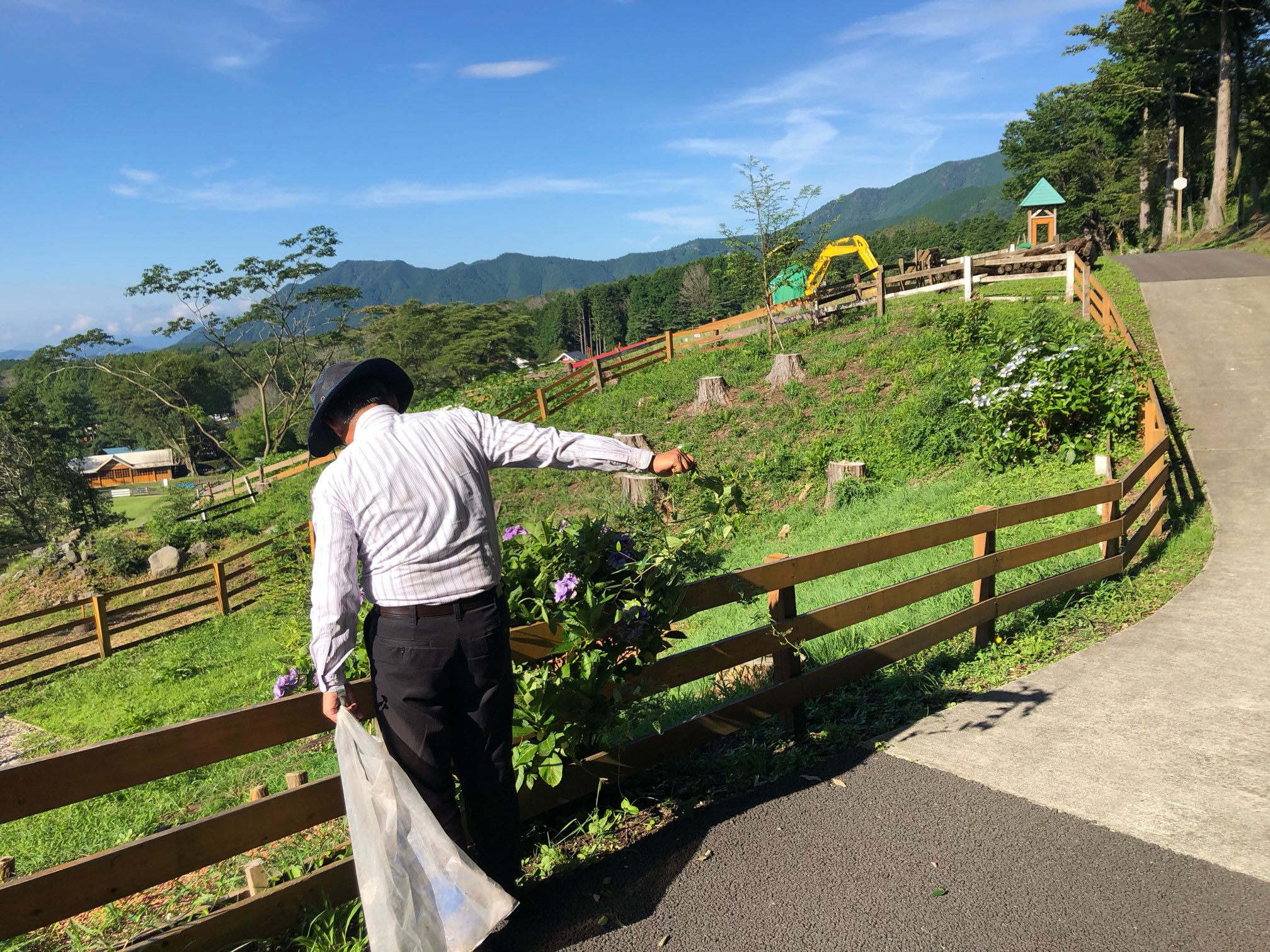朝、そのフォトスポットの周辺の植木(出っ張った枝)をハサミで切りまくる作業をする馬飼野社長。