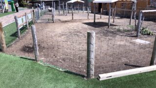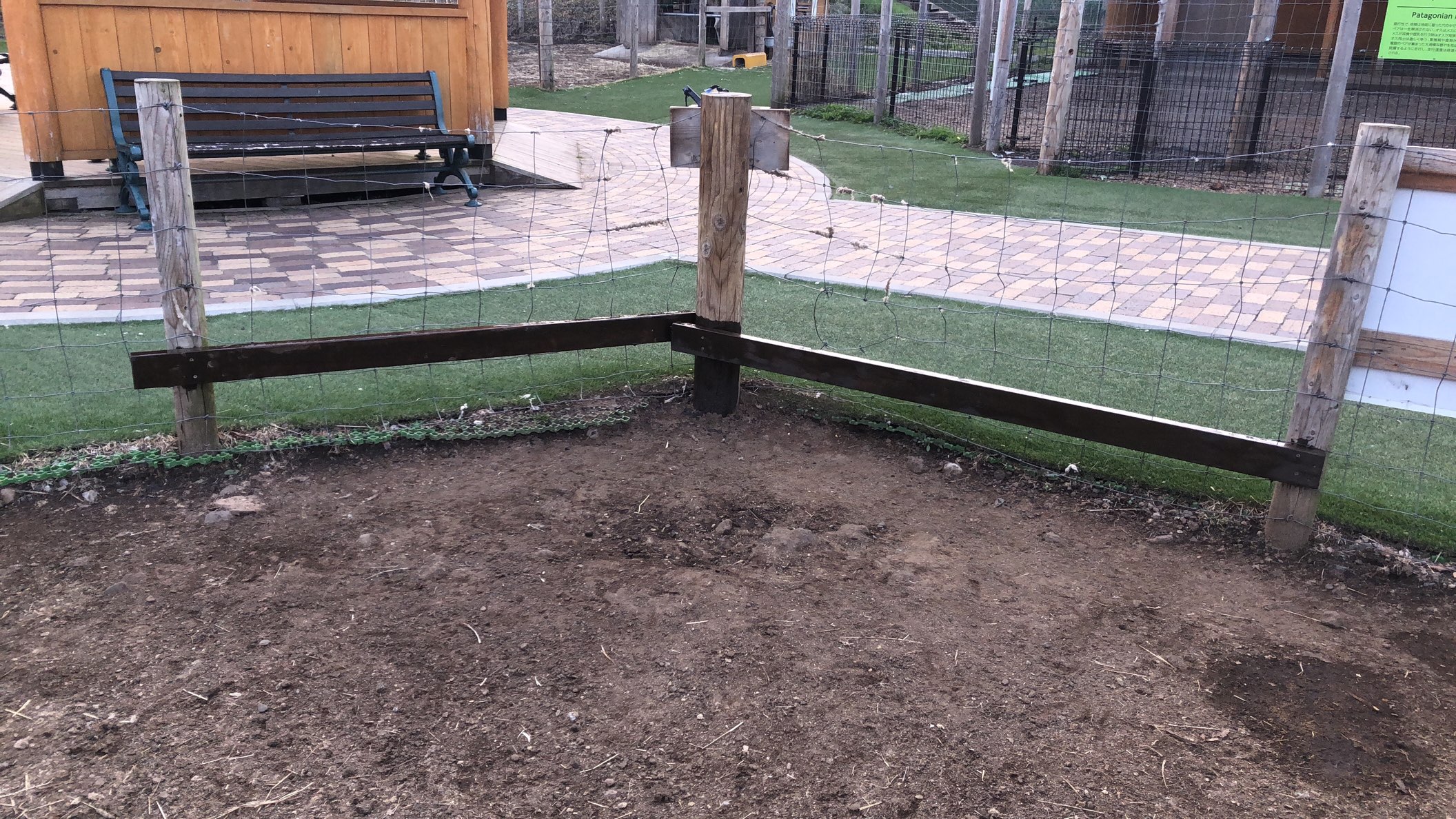 アミの柵で、トダお姉さんが壊れたハリガネ柵を直しており、