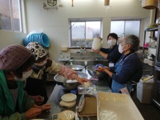 「コメの粉(上新粉)」と、「モチ米の粉(白玉粉)」をお湯で練り合わせ、(大きさを計りながら)団子にして「蒸す」。(少々の塩とお砂糖も入ります)