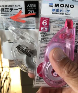 修正テープ。同じ値段なのに、片方は20m分あり、片方は8m分だった。
