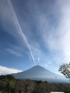 牧場から見て、富士山山頂から右上に向かって国内線の航空路があります(写真の飛行機雲の線の部分)。