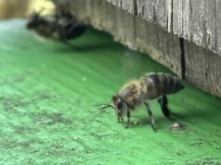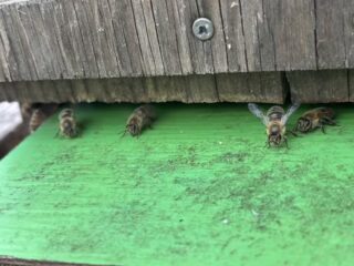 ウチのニホンミツバチちゃんたちが、巣箱の入り口で一生懸命なにかしてる。