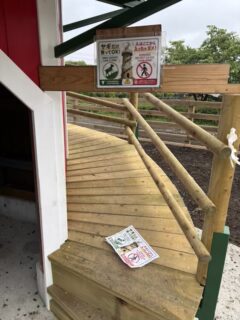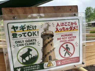 「この塔には、人間は登れませんPOP」が、ヤギによって見事にボロボロにされた。(画像下の、落ちているモノ)