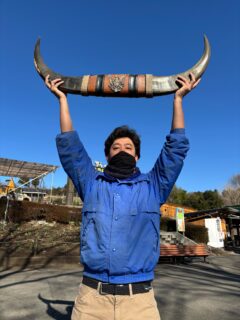 モトキお兄さんが持っているのは…ウェスタン風の、牛の角飾り。