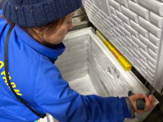 冷凍庫の物も全部出し、壁にガッチリついたシモ(氷の塊)を取りまくるなども。