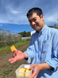 ぶどうランドの収穫に誘った「えいちのむら」のダイスケさん。