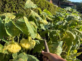 抜かずにとっておいたヒマワリの花部分を、刈り取って集める。