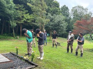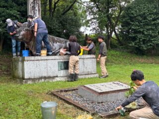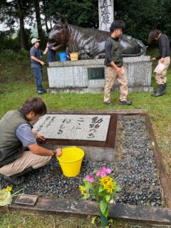 お盆なので、牧場の皆で慰霊碑を磨き上げる。
