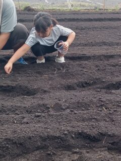 「自分たちの畑に、自分の手で種をまく」 ※ここの土は、真っ黒。「クロボク」と呼ばれる土です。