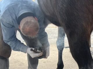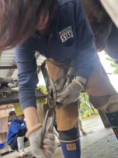 装蹄を学び始めたマツモトお姉さん(馬担当)。