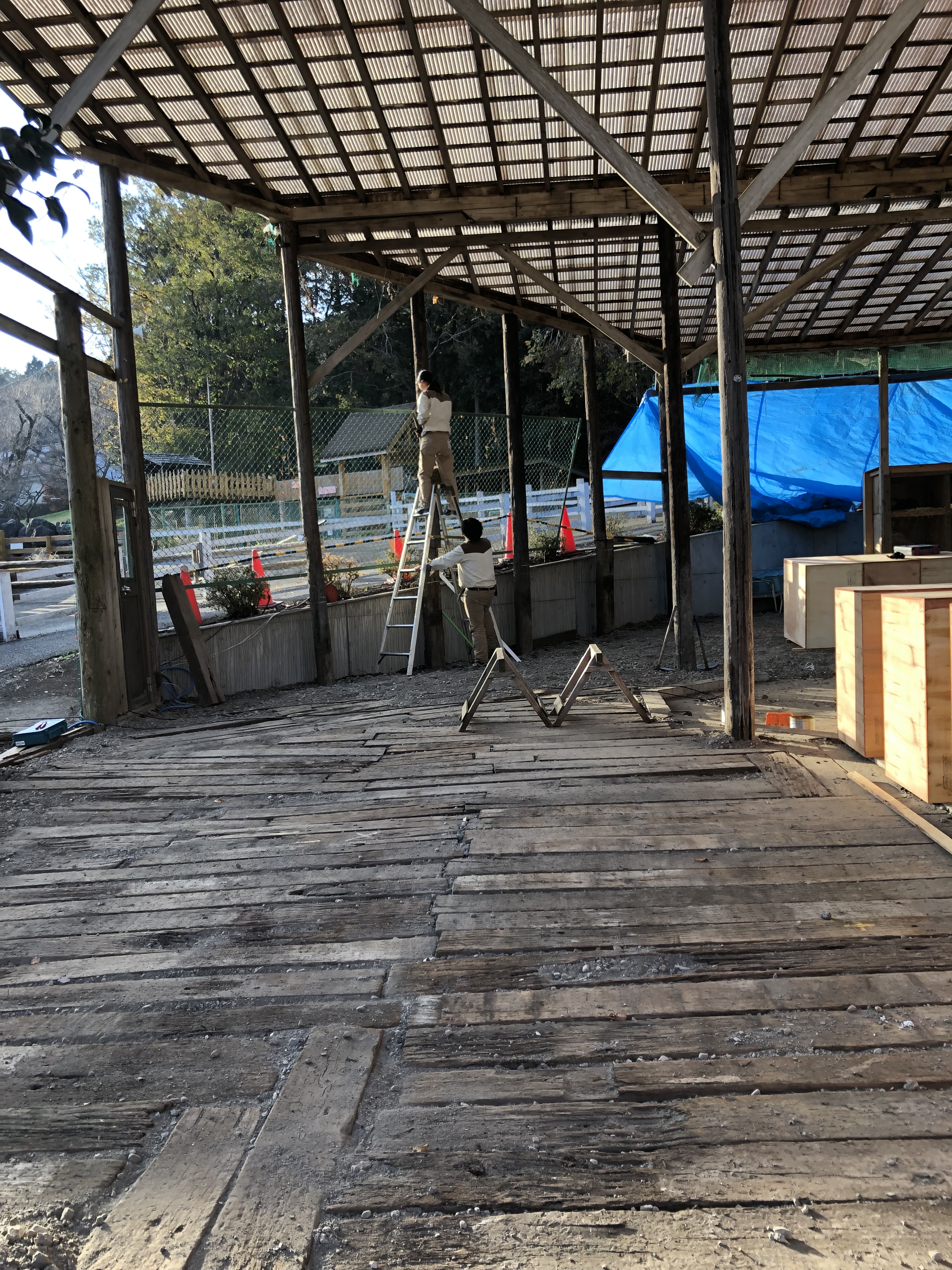 過去、バードケージだった場所を、ウサギとモルモットの屋根下ふれあい広場にするため、改装工事の自分たちでできる部分は自分たちで行う。