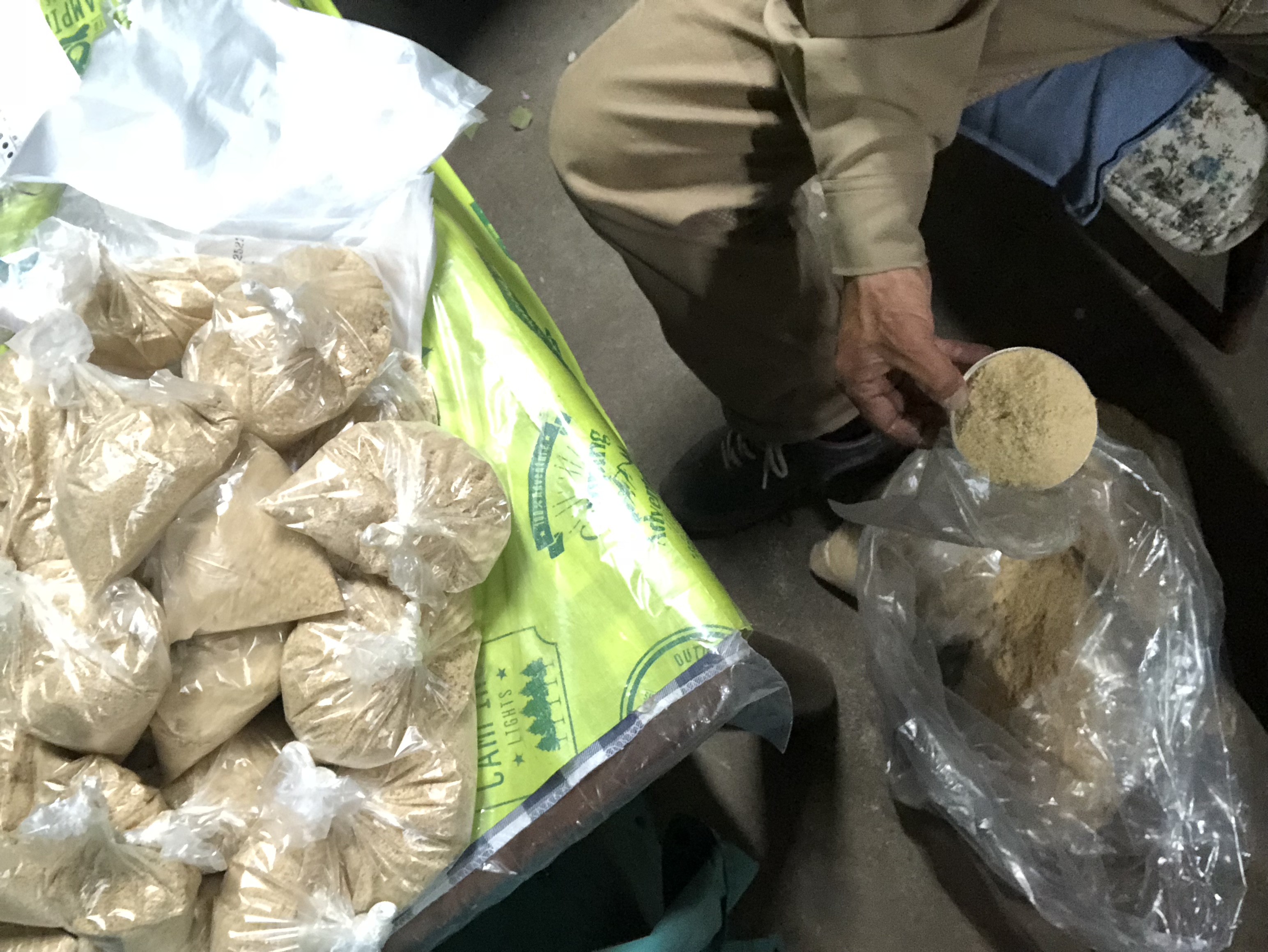 自分で精米所をまわって米ぬかを集め、それを小袋にこのように詰めて、準備しております。