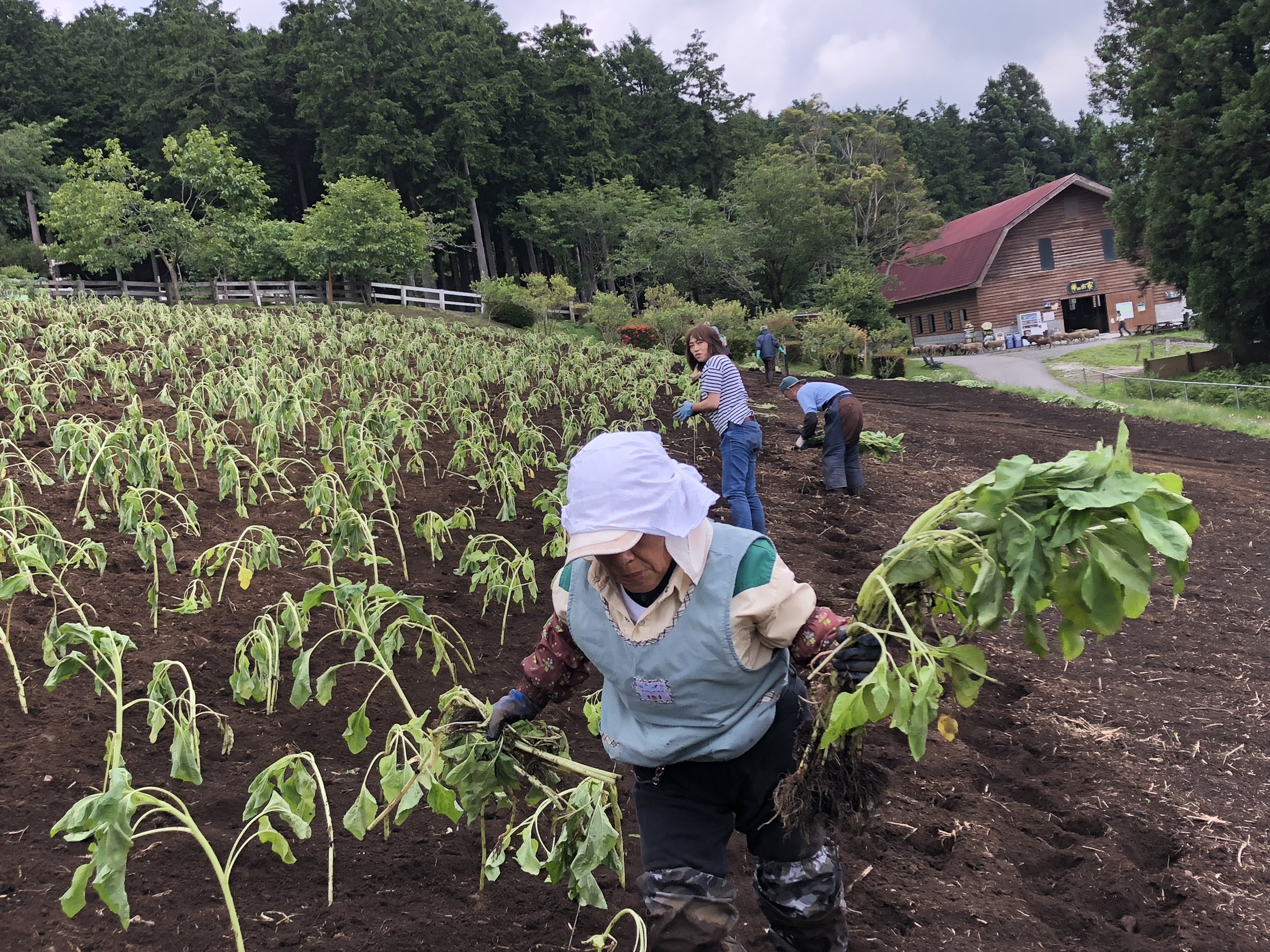 ひまわりの苗約5000本を、多くのスタッフに声をかけ、朝7時から作業開始。