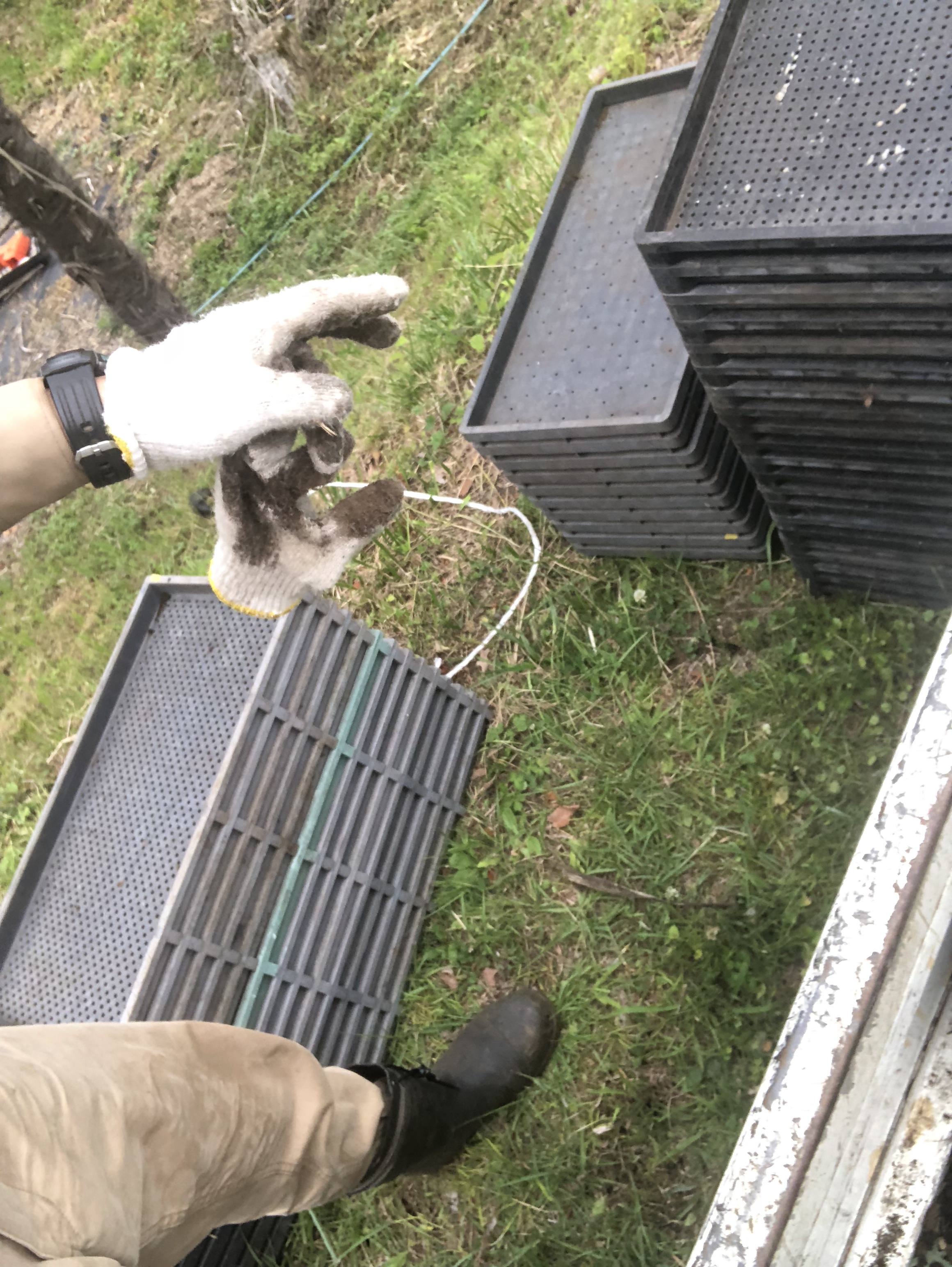 ひまわりの苗を運ぶのに、稲の育苗トレーを何十枚も使いました。
