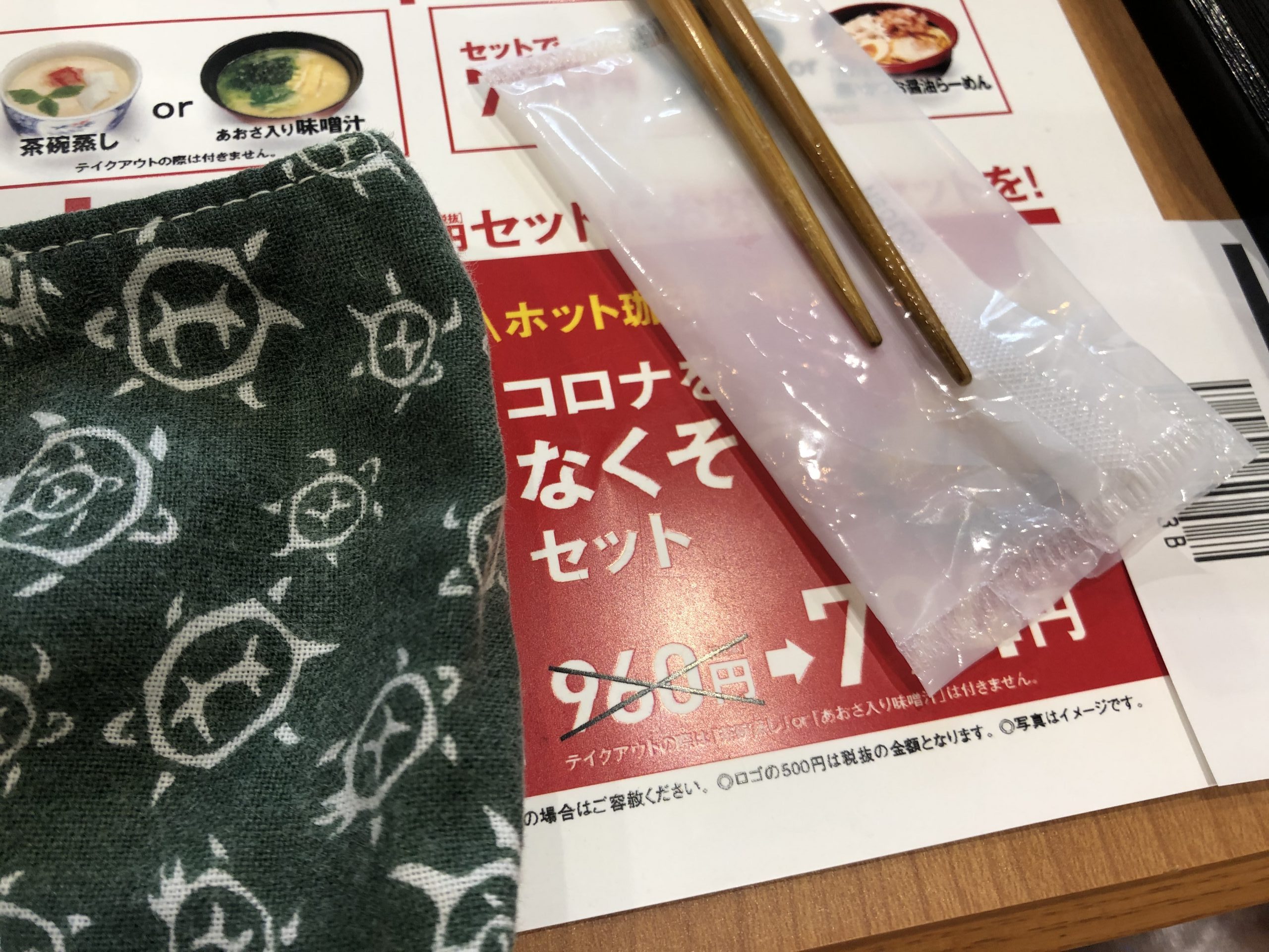 置いたマスクや箸で「コロナをなくそうセット」の名前が・・・・