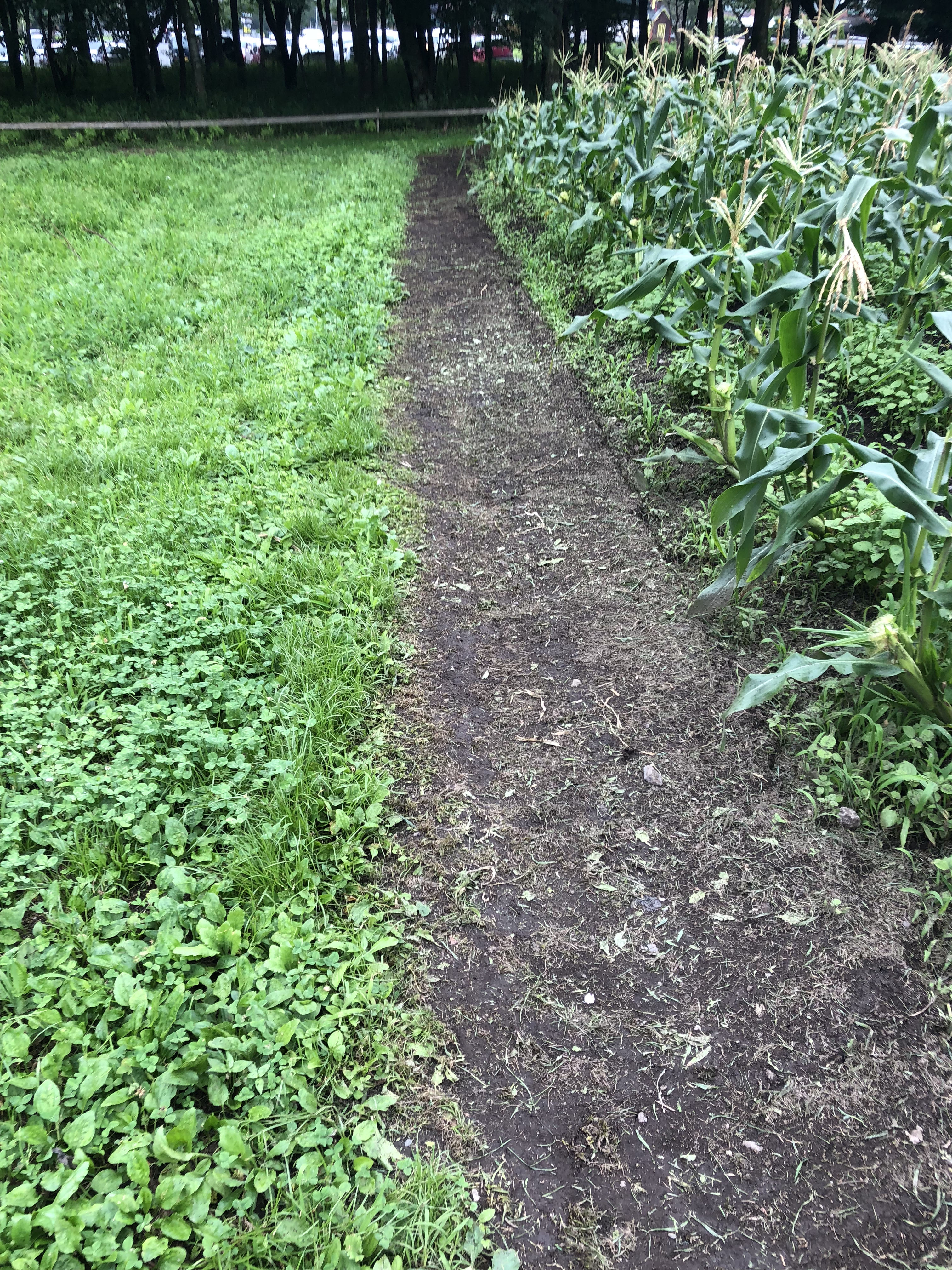 トウモロコシ畑の周りを、しっかりと地面すれすれで草刈りする。