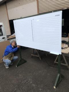 営繕のオジサマたち用のホワイトボードを社長が即座に購入し、ウエダおじさんがあっという間にしっかりした脚を作る。