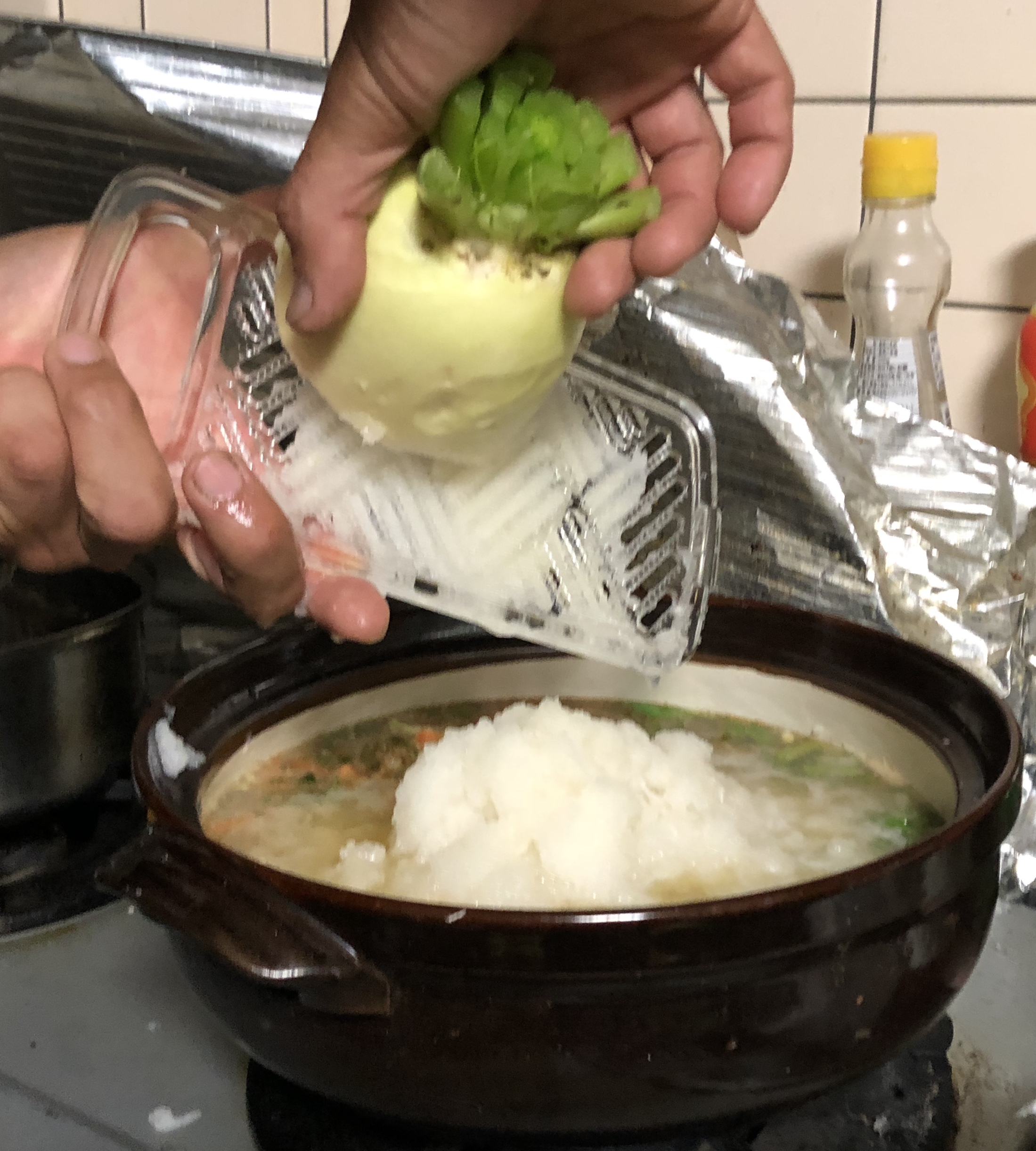 大根1本丸々すりおろしながら、肉や野菜(大根葉含む)を入れて煮込み、ミソで味付けして完成。
