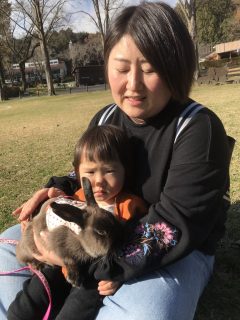 ウサギさん大好きなアヤネちゃん、いつもふれあい広場のウサギさんと遊んでいましたが、昨日は初めてのうさんぽ体験!