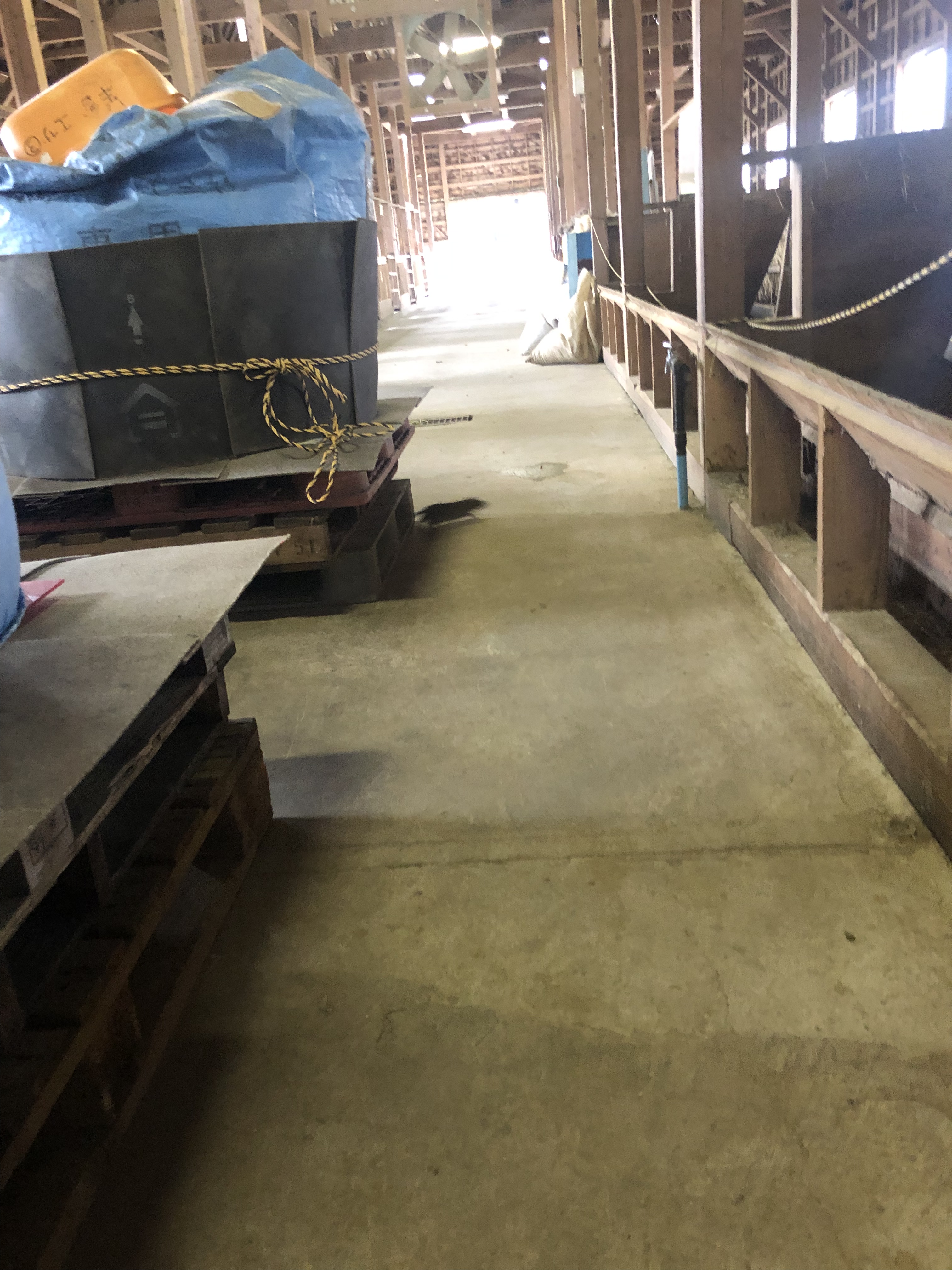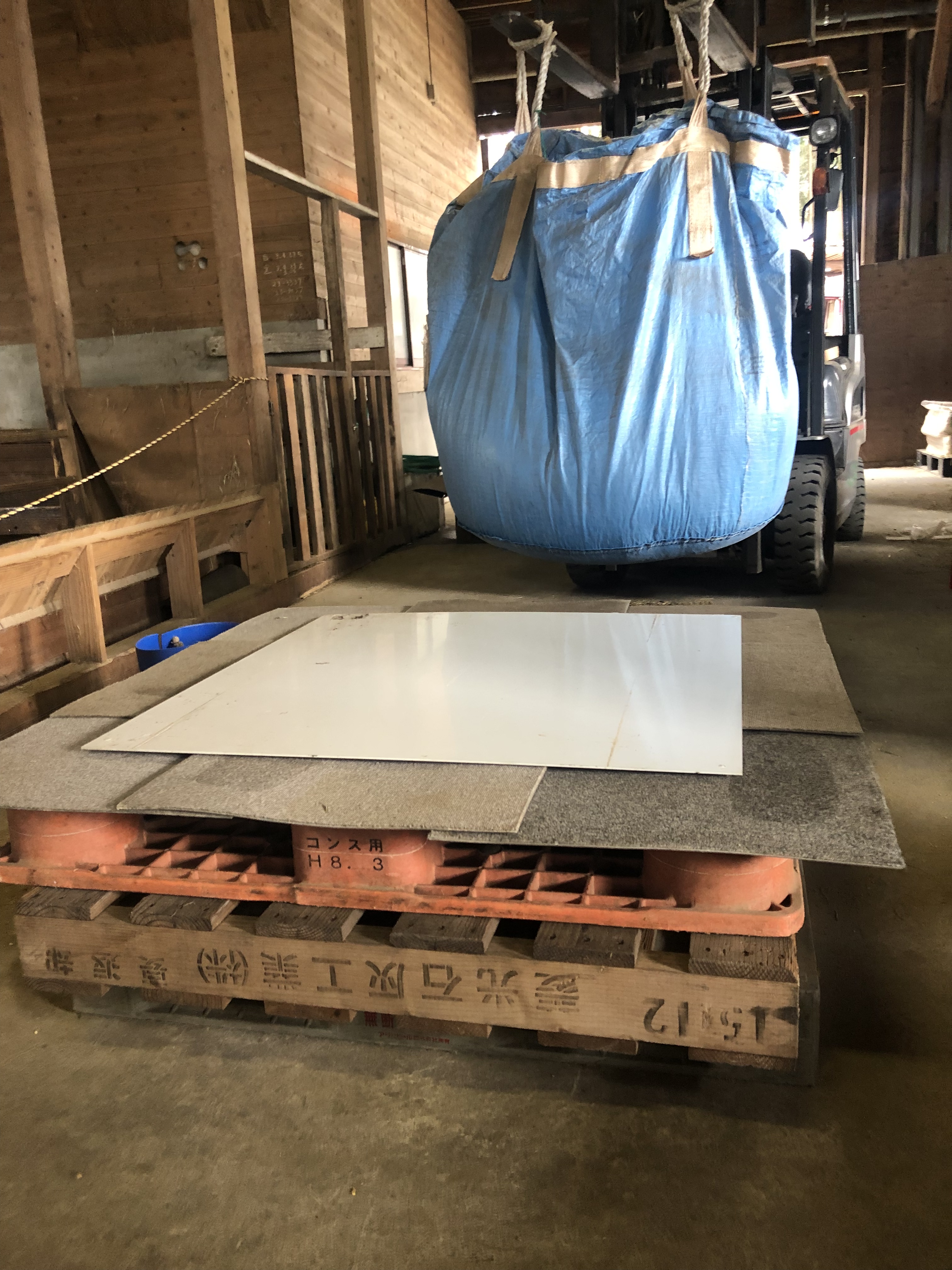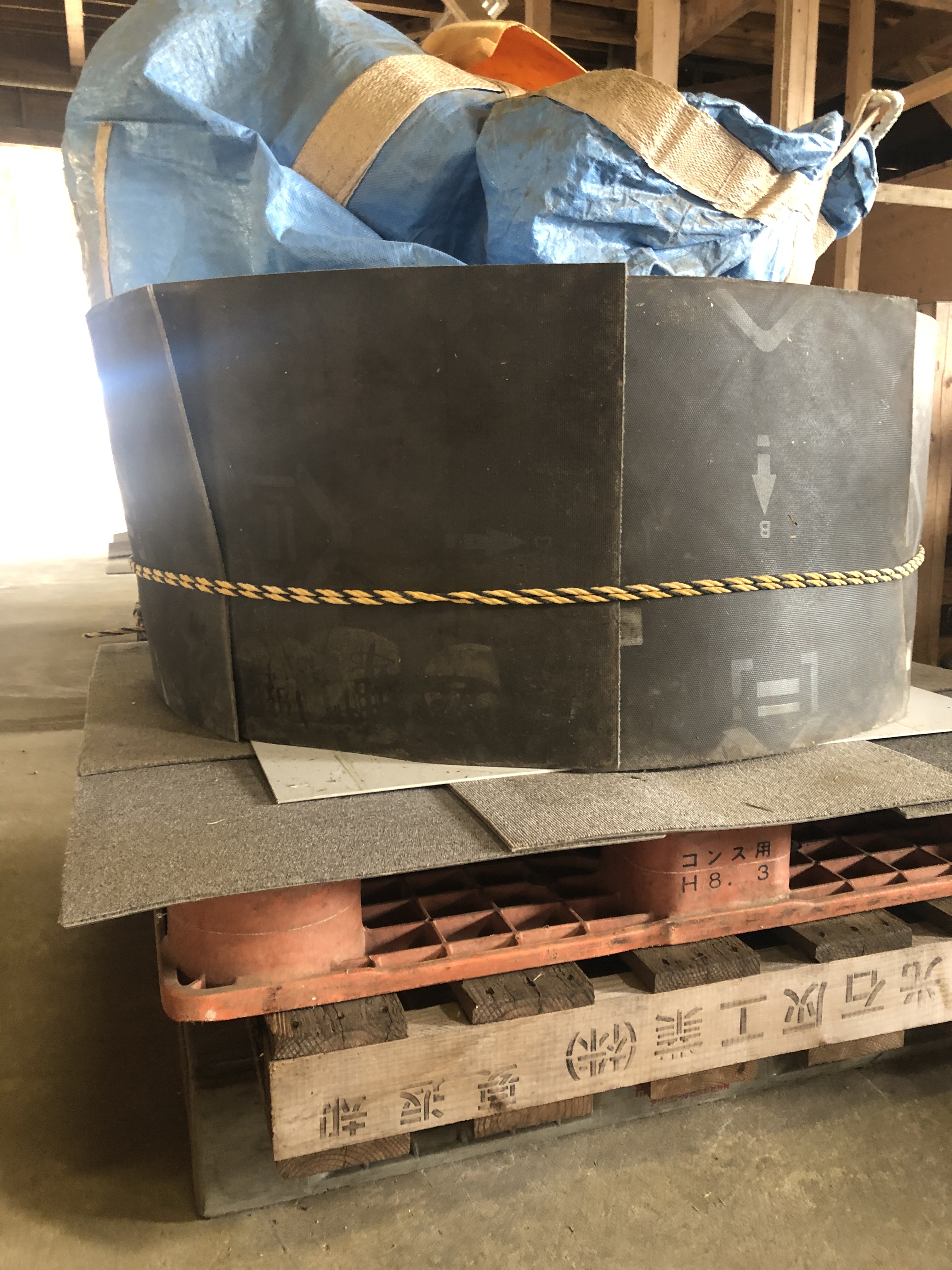ネズミがフレコン(写真の水色の大袋=フレキシブルコンテナ)の底に穴をあけて、餌食べ放題。