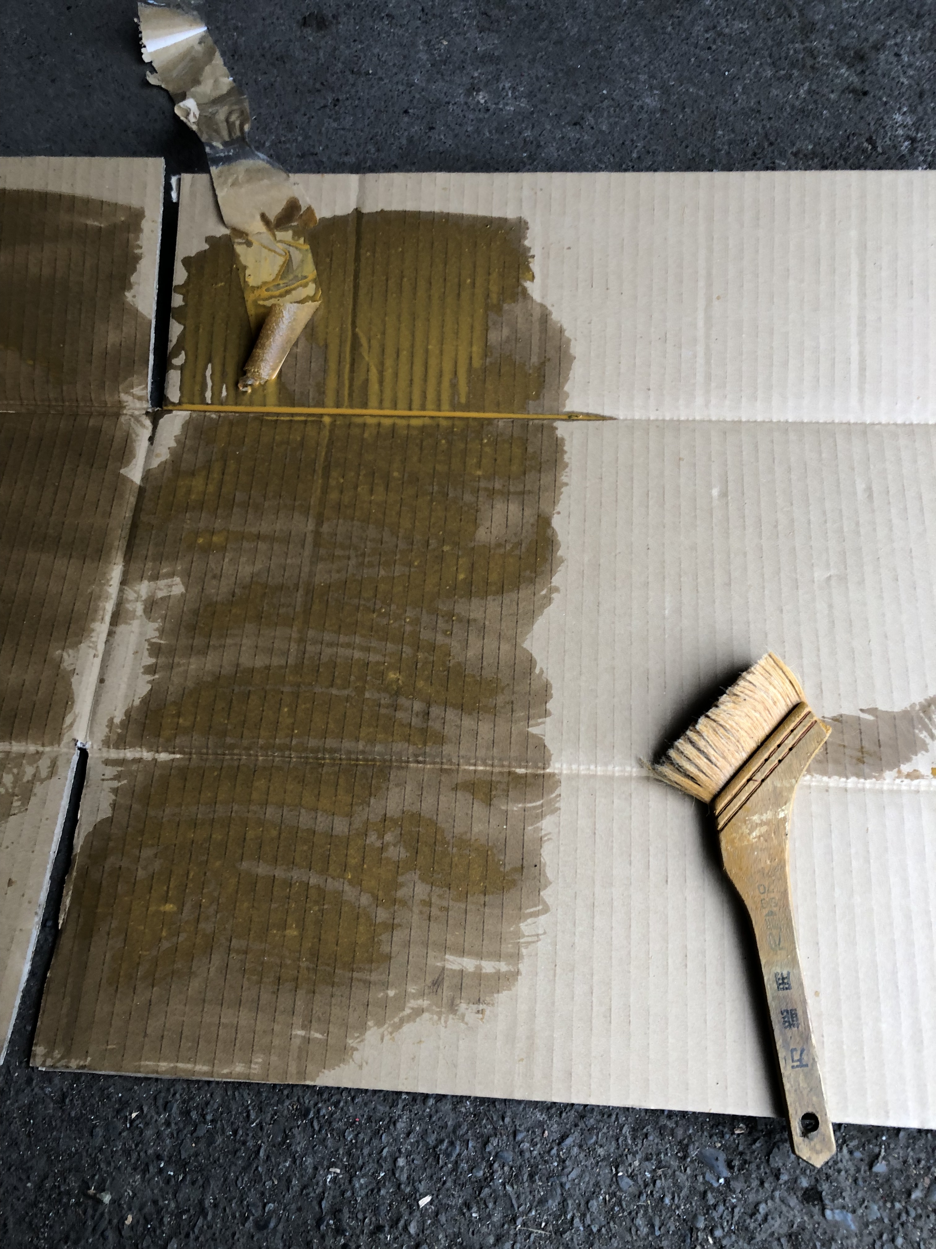 やり方は、まず新聞や段ボールにぬぐえるだけぬぐって(5秒くらいで十分)、そのあと、1回に使うシンナー量は「この写真ぐらい」を、しみこませる。