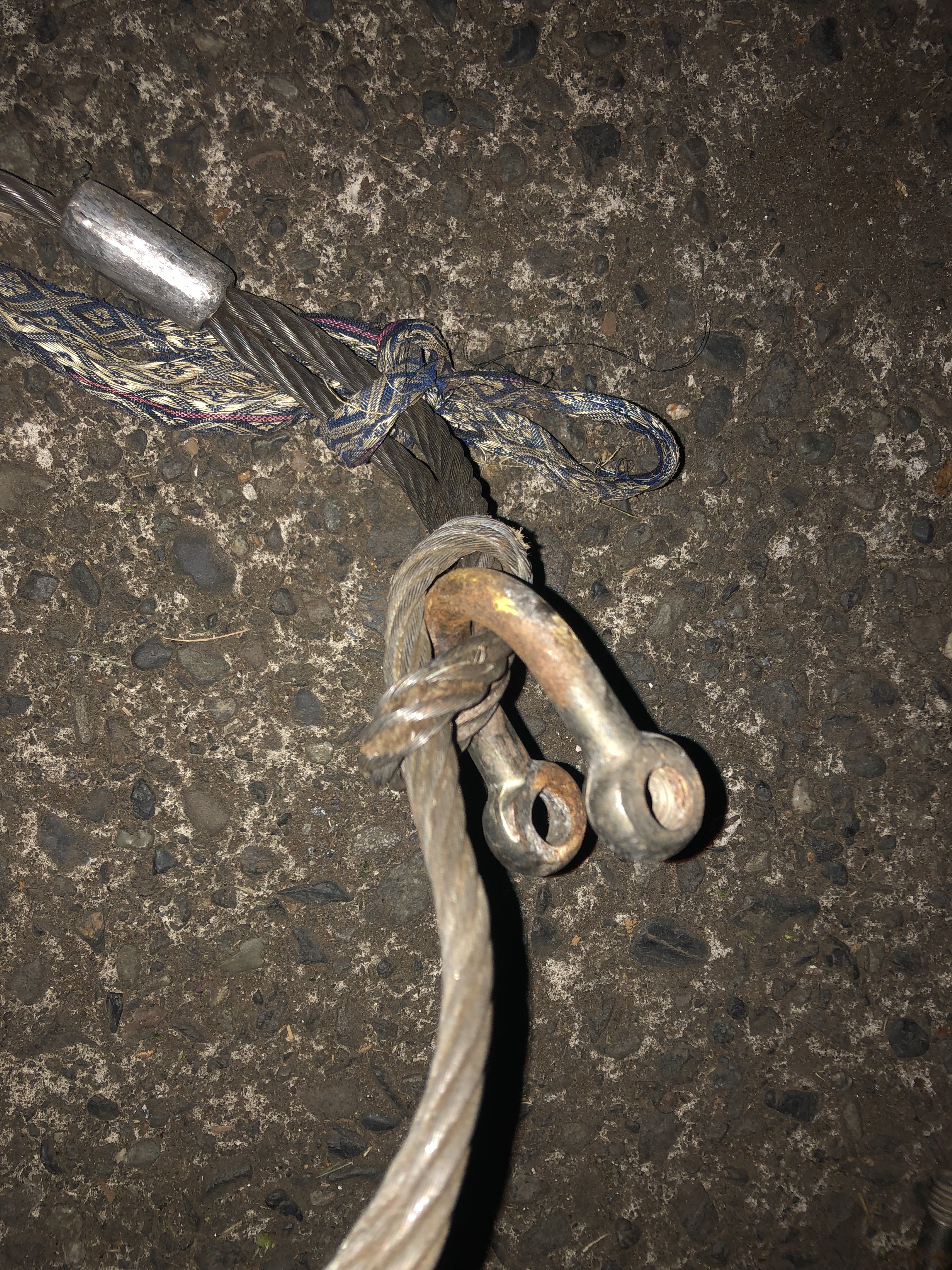 ワイヤーをつなぐ際、超重量がかかるとギュッとなって締まってとれなくなってしまうことがあるので、あえて、シャックルをかませて、外れやすくした。