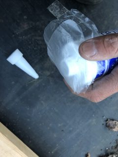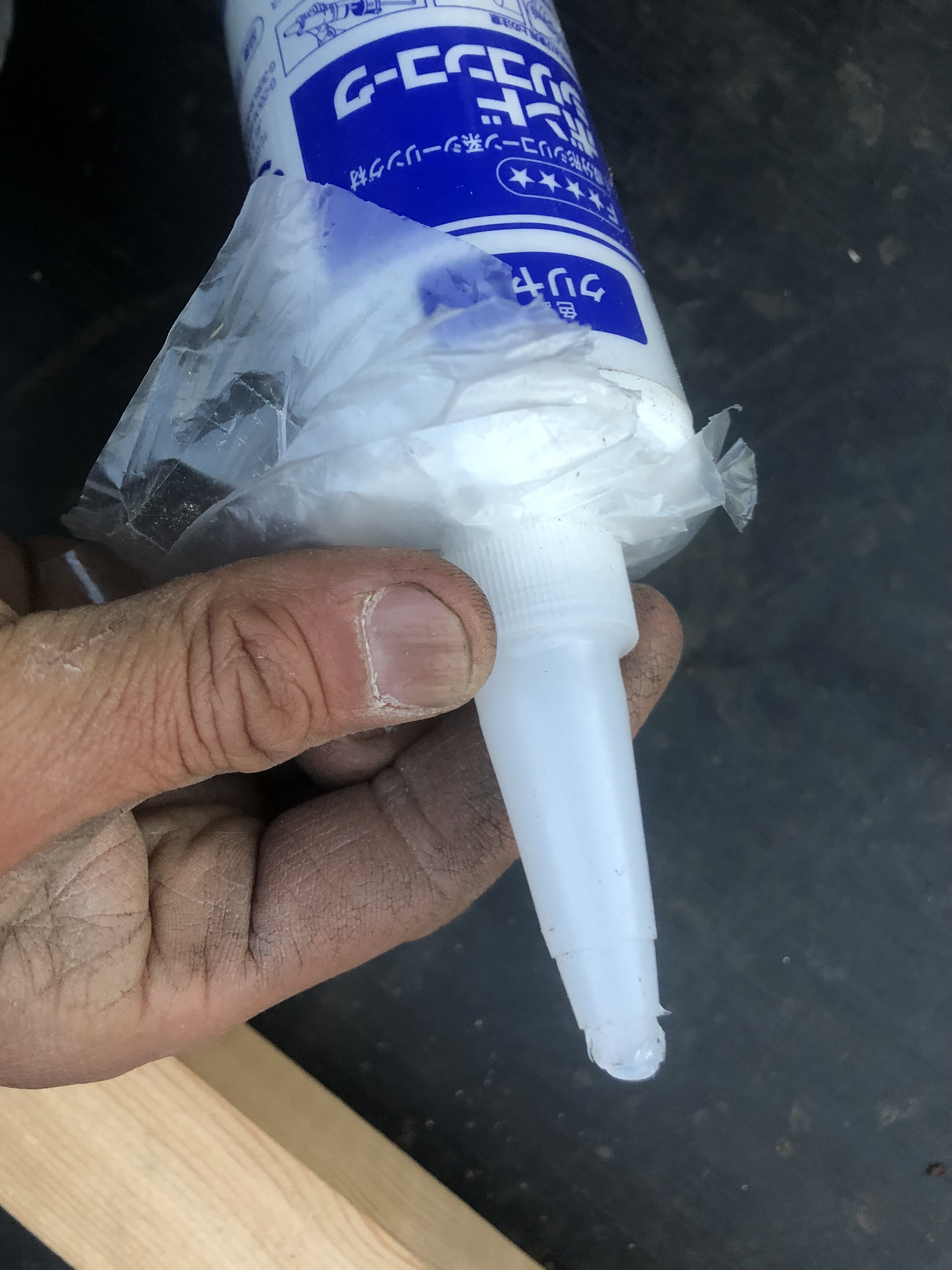 余ったコーキング、保存方法を知らないと、先っぽにビニールをかけてひもで縛ったりしちゃう。