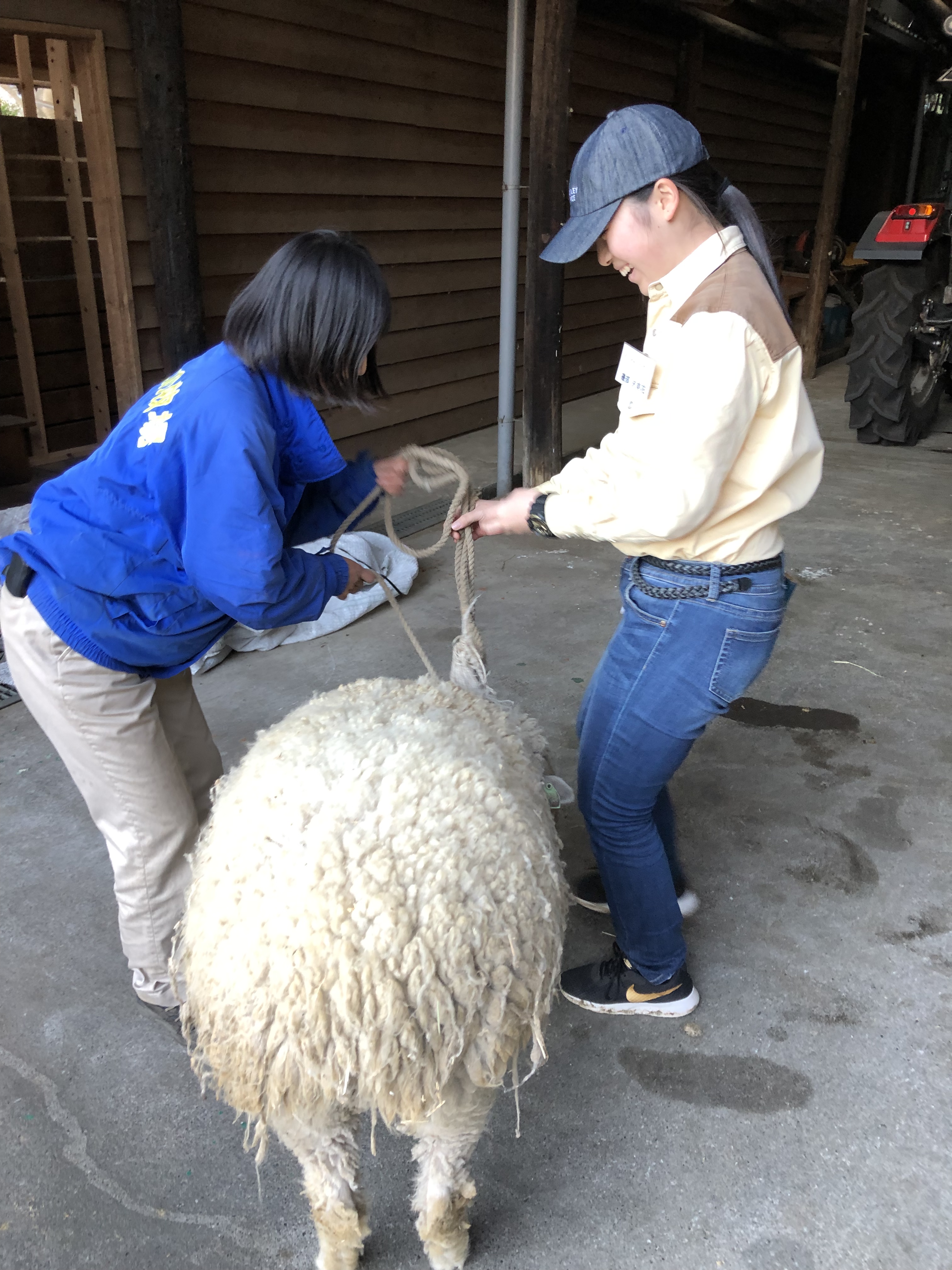 ヒツジの保定を、マツダお姉さんが実習生さんに教授中でした。