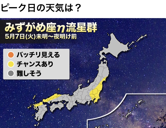 放射点はみずがめ座方向ですが、現れるのは「夜空全体」なので、「今は夜の流れ星の出現数が増えている」と考えていただければ。