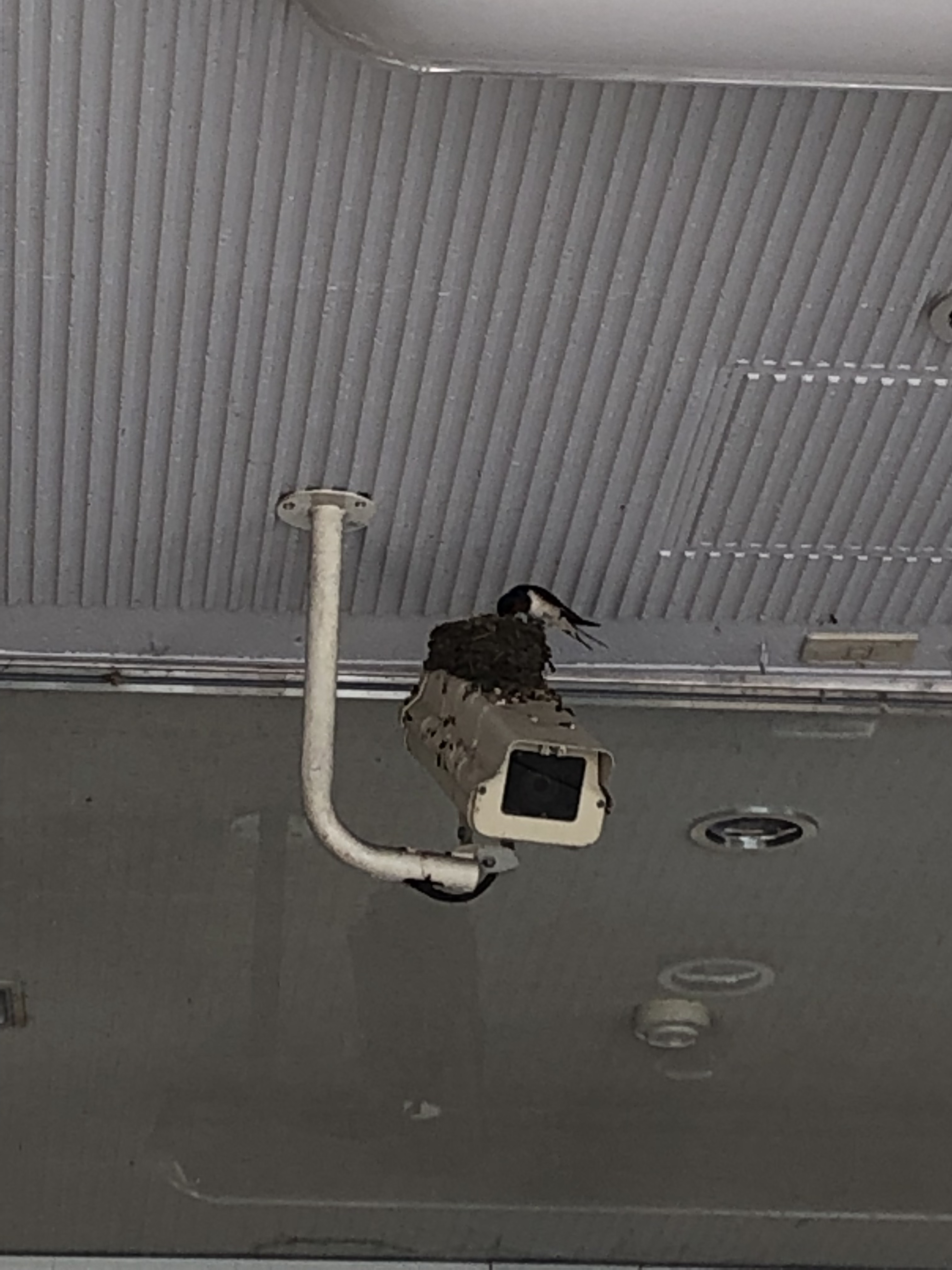 売店入口真上のツバメの巣に、すでにいるヒナよりも1週間分は大きいヒナを