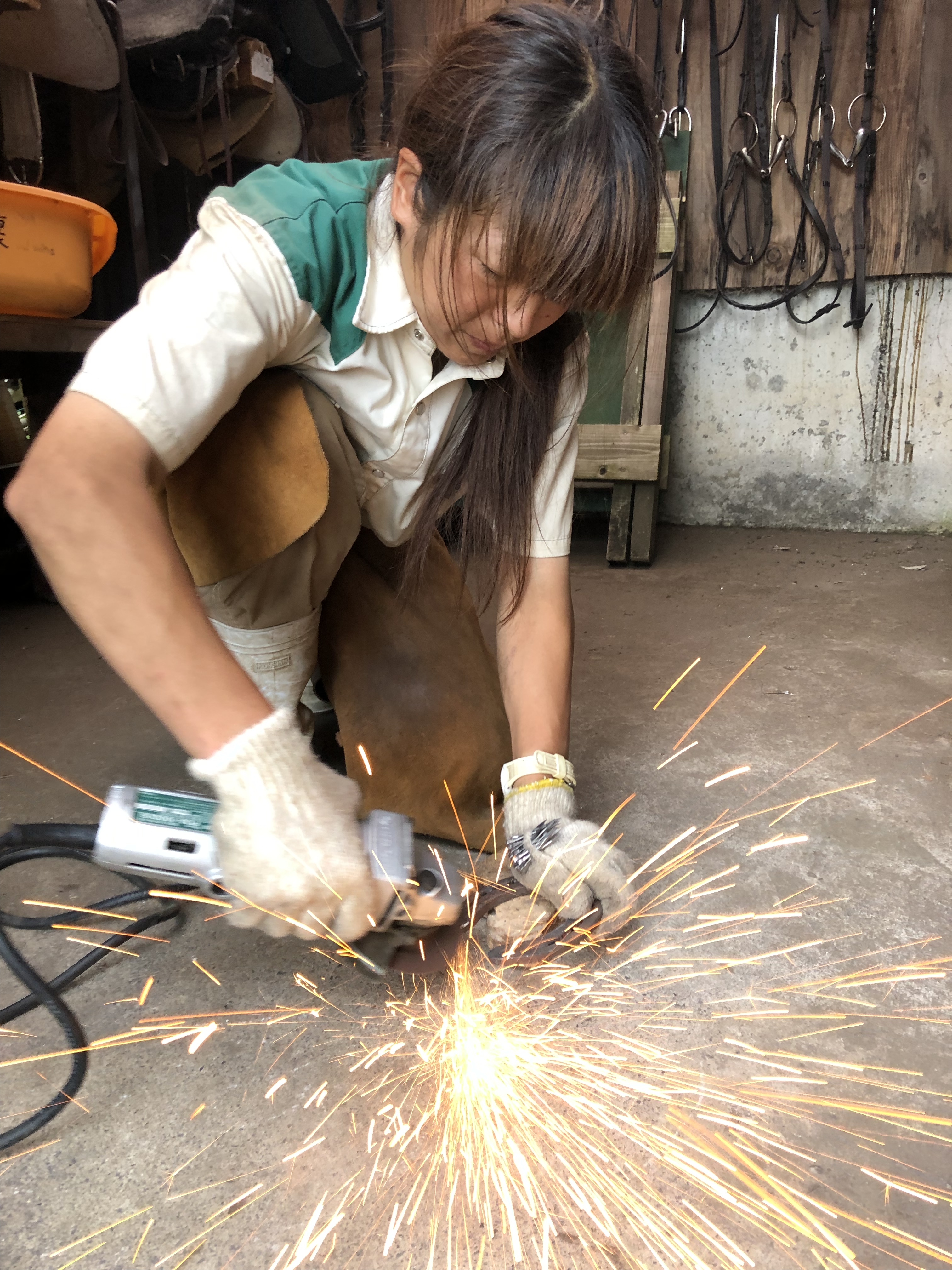 除鉄(蹄鉄を外す)やグラインダー掛け(写真)、装鉄等の作業的技能を磨くのは