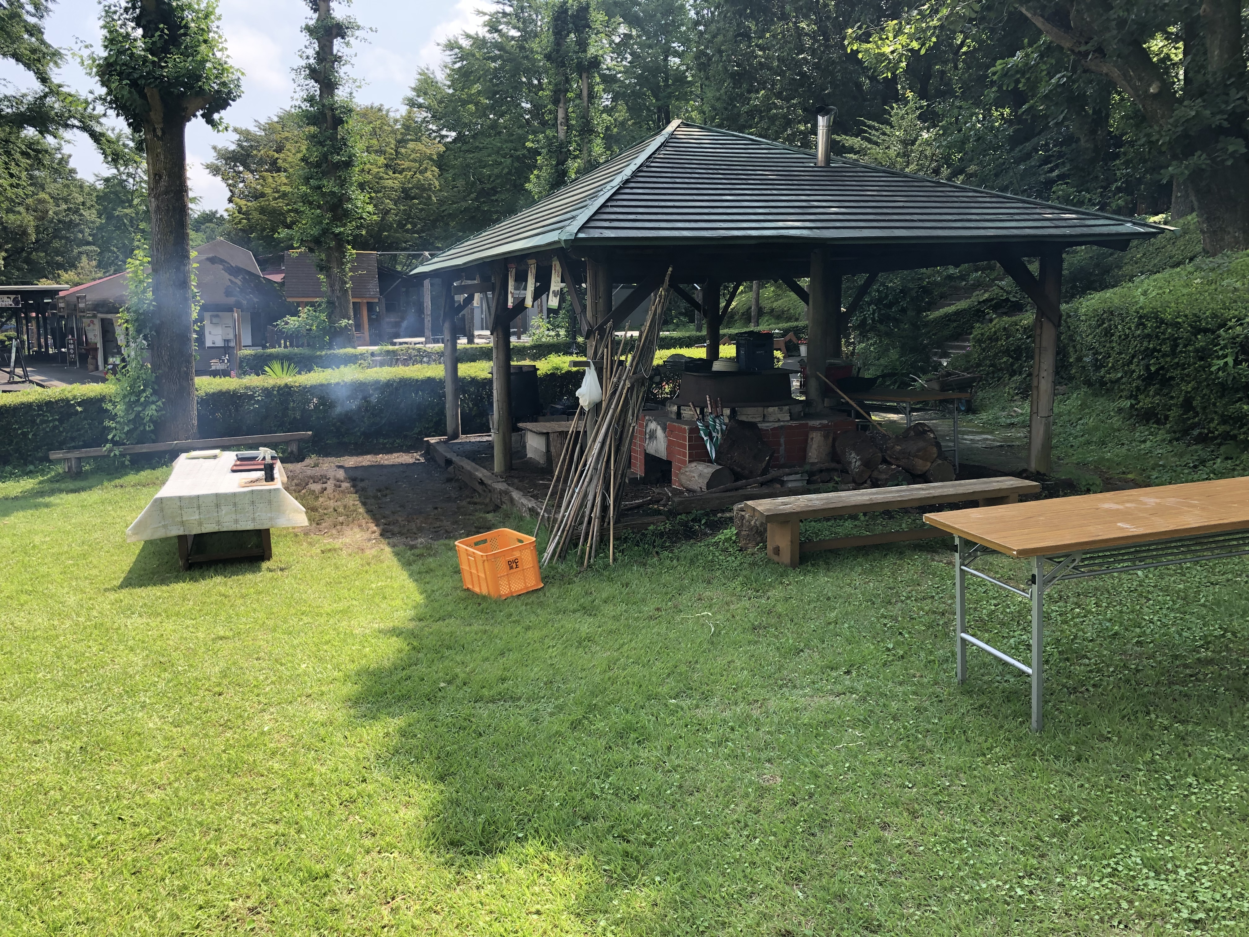 みんなが皮をむいたりするところとして、テーブルなどを用意しておりますが、暑すぎるので