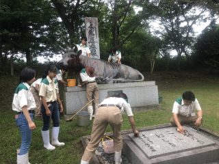 まずは牛の銅像を磨き上げ、碑の周りを掃除。