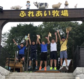 ふれあい牧場の入口では子供たちが宙に浮いており、