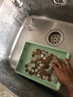 慰霊碑のお賽銭を回収し、(灰だらけなので)洗って拭いて、